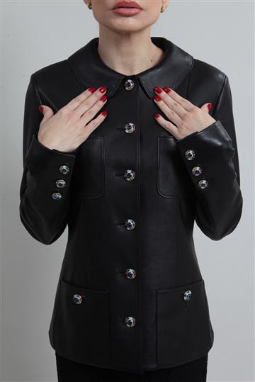Blazer Chanel Couro Cordeiro com Botões de Pedrarias Preto