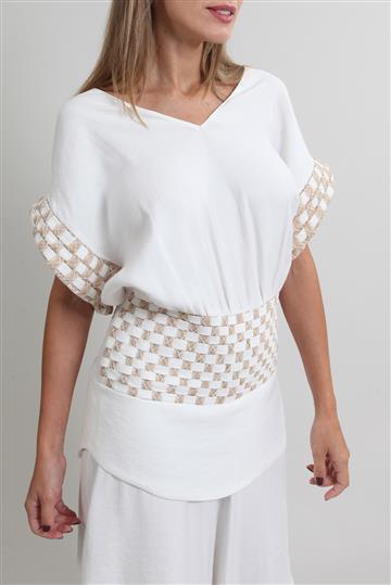 Conjunto Sophia Hegg Saia e blusa tecido tramado Bege