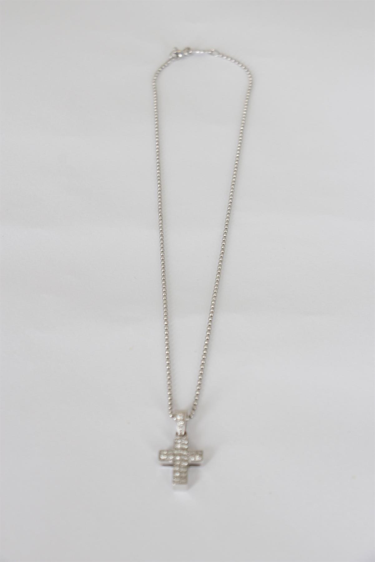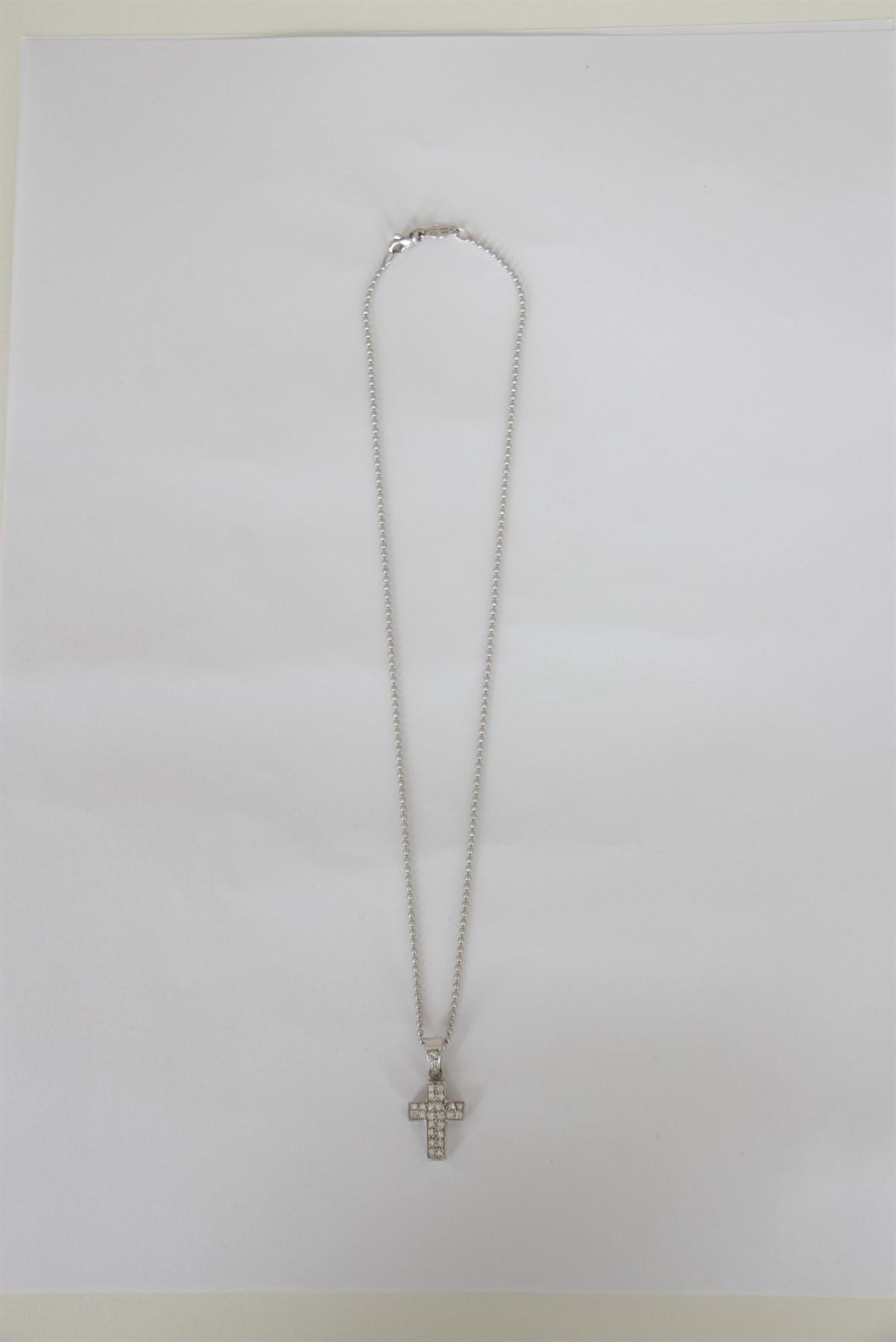 - Corrente em ouro branco 750- Corrente curta com esferas- Maleável- Pingente central de crucifixo cravejado- Fechamento por fecho traseiro de encaixe