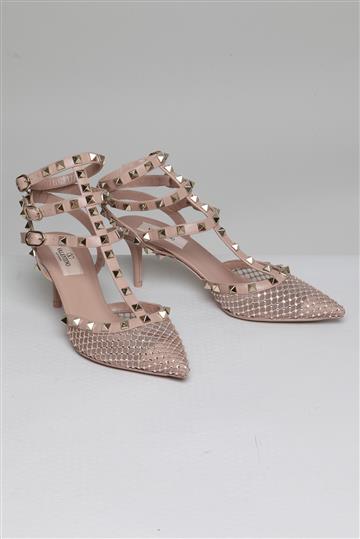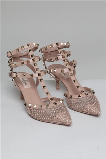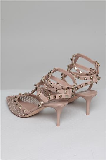 - Tiras triplas posteriores com pequenas fivelas metálicas laterais para fechamento