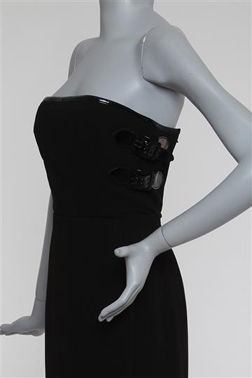 - Vestido em tecido encorpado estilo alfaiataria com detalhes em couro envernizado