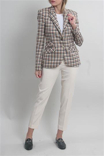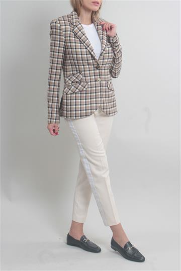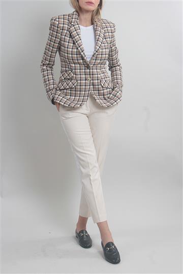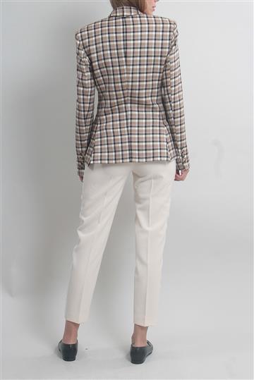 - Decote alongado em 'V' com lapelas de pontas duplas