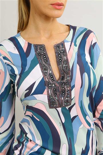 - Bordados decorativos com pequenas miçangas ao redor de todo o decote