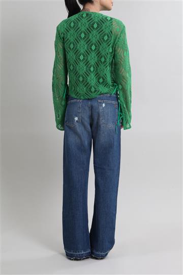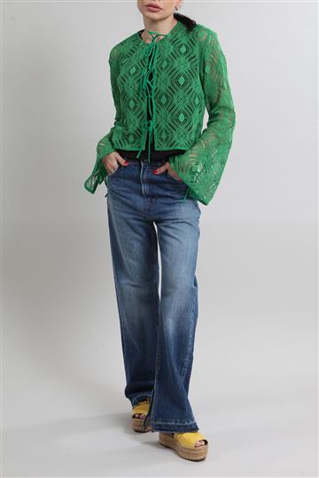 - Mangas longas retas com punhos amplos e amarração lateral decorativa