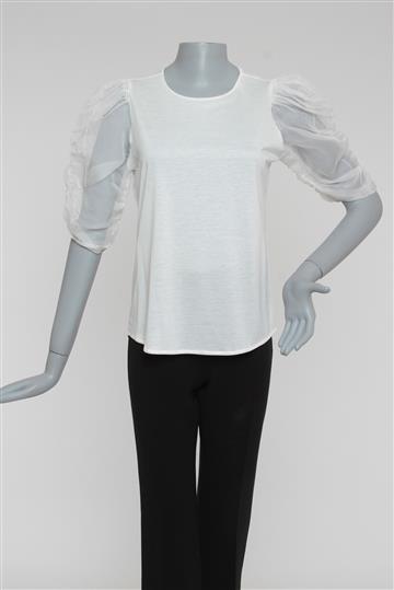 - Mangas curtas bufantes com franzidos laterais e elasticidade para ajuste