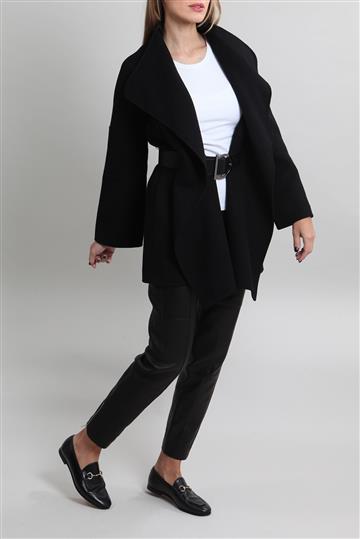 - Abertura frontal alongada com lapelas assimétricas amplas