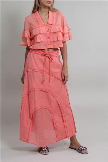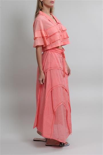 - Cintura alta com cós reto e amarração frontal para melhor ajuste ao corpo