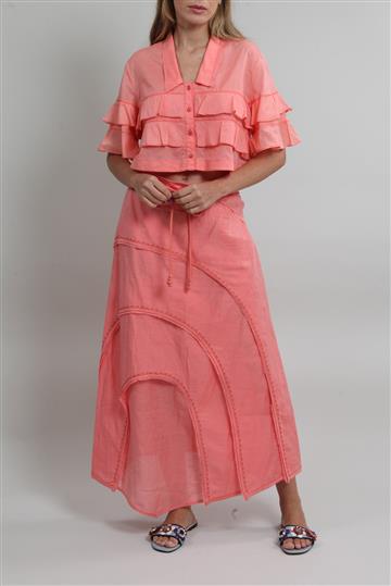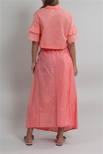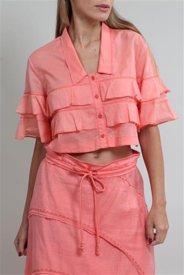 - Camisa possui modelagem reta e ampla com estrutura em camadas