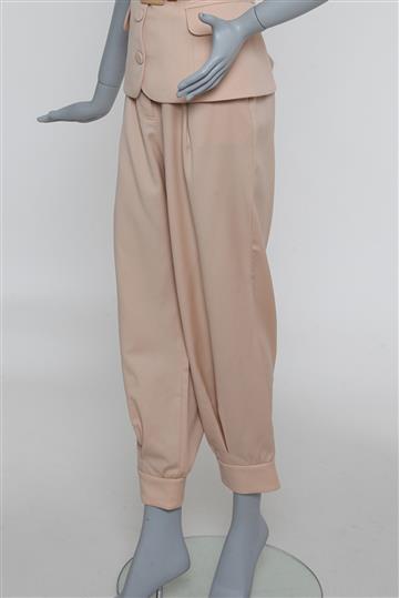 - Calça possui modelagem reta e ampla estilo cenoura