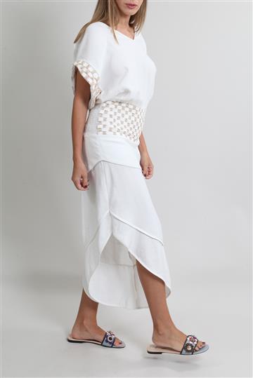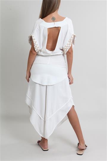 - Pernas amplas com recortes e acabamento por viés de espessura reduzida