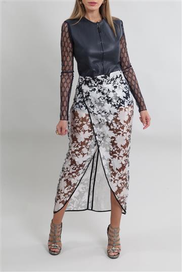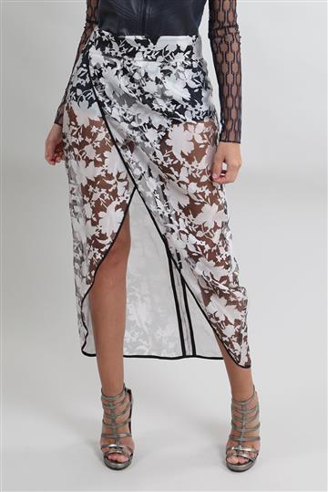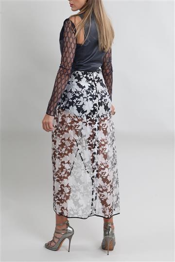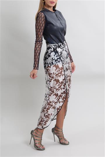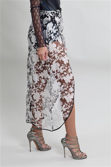 - Saia em tecido leve e encorpado com transparência aparente