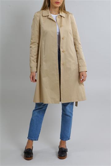 - Cintura alta com cós reto e pequeno adorno metálico aplicado à lateral