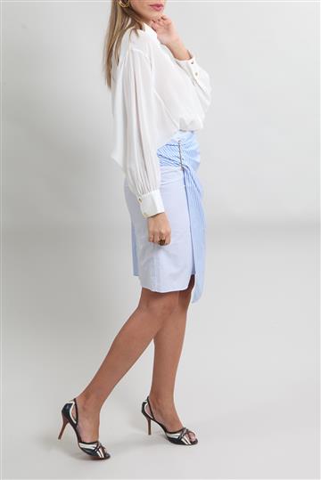 - Pala drapeada assimétrica e sobreposta com fivela metálica aplicada