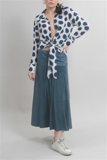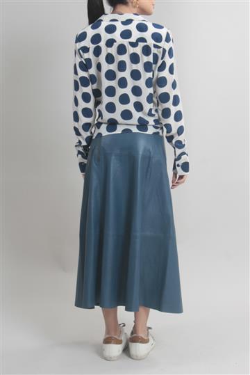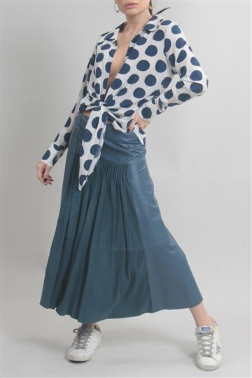 - Saia em couro liso e encorpado de toque macio com detalhes em camurça