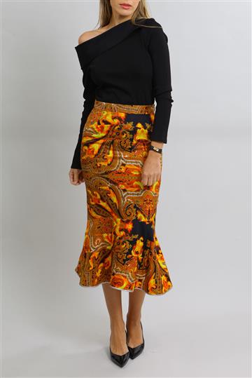 - Mix de tons de laranja com detalhes em preto, branco e bege