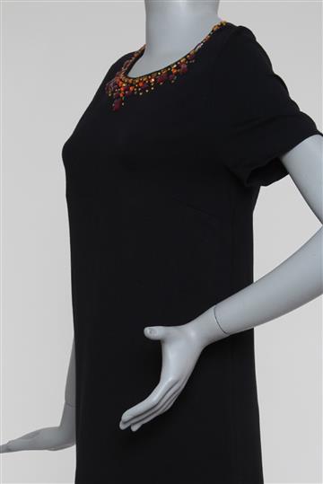 - Decote arredondado amplo com pedrarias aplicadas ao redor