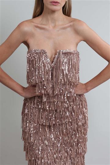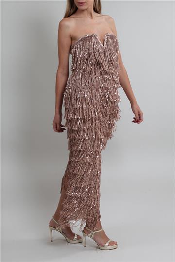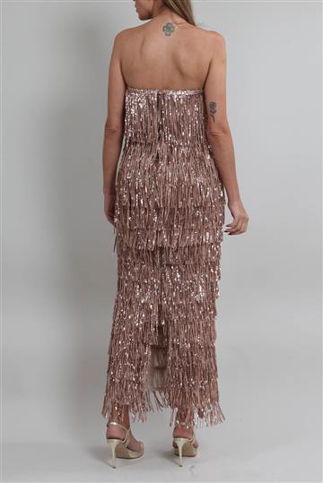 Vestido Bronx & Banco Longo Paetês com Franja Dourado
