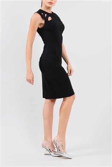 - Decote arredondado alto com recortes vazados decorativos ao redor