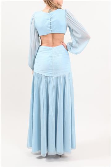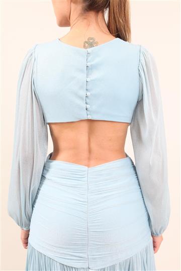- Decote em 'V' alongado com faixa de tule interna para maior cobertura