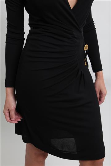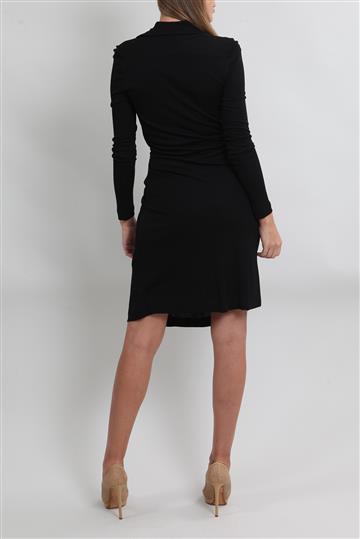 - Decote transpassado e alongado em 'V' com gola de pontas clássica