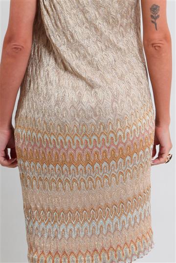 - Drapeado na lateral em tons de dourado e prata.
