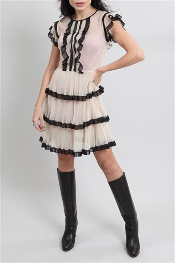 - Fechamento posterior por zíper aplicado e abotoamento delicado