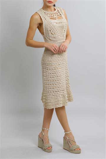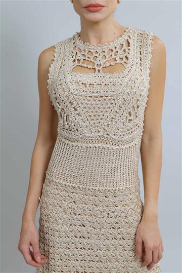 - Vestido em crochê encorpado com fios de lurex aplicados à trama