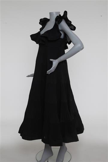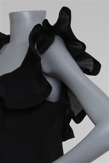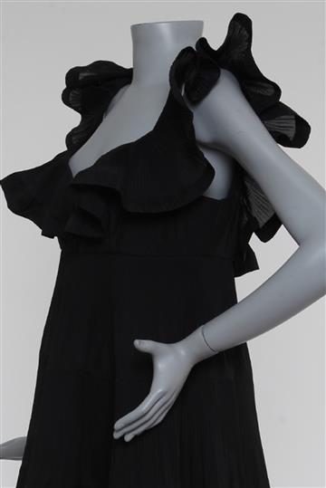 - Decote anatômico estilo coração com recorte central alongado e babados aplicados