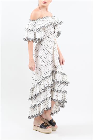- Babados bordados aplicados ao redor de todo o decote