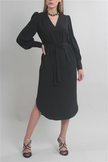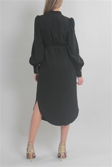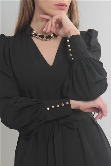 - Decote em 'V' com gola padre superior e corrente decorativa