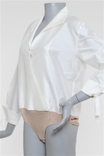 - Mangas 3/4 retas com punhos estruturados e amarração lateral