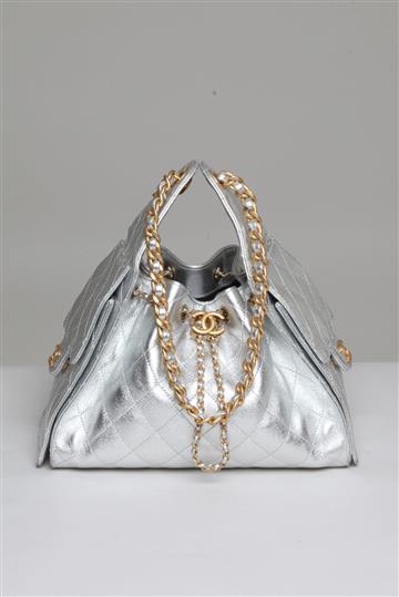 - Alça fixa e alongada para uso nos ombros composta por corrente metálica e tira de couro interna